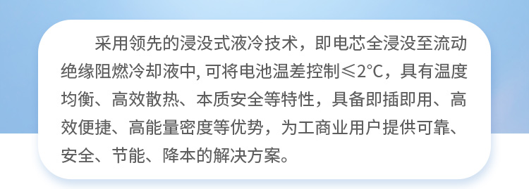 极致的安全防护: 浸没式设计有效隔绝氧气,抑制热失控蔓延,实现Pack级主动消防,从根本上提升储能系统安全性。
